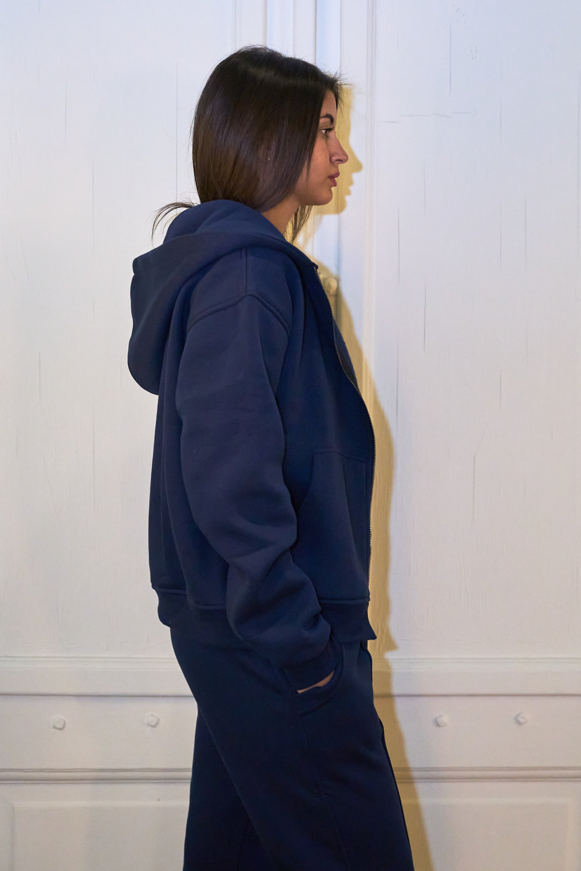 The Navy Essential Zip-Up is made from a premium heavyweight cotton blend, it balances structure with softness for a comfortable yet elevated feel. Designed with a relaxed unisex fit, it features a smooth full-length zipper, kangaroo pockets, and clean seam detailing that adds a refined touch.